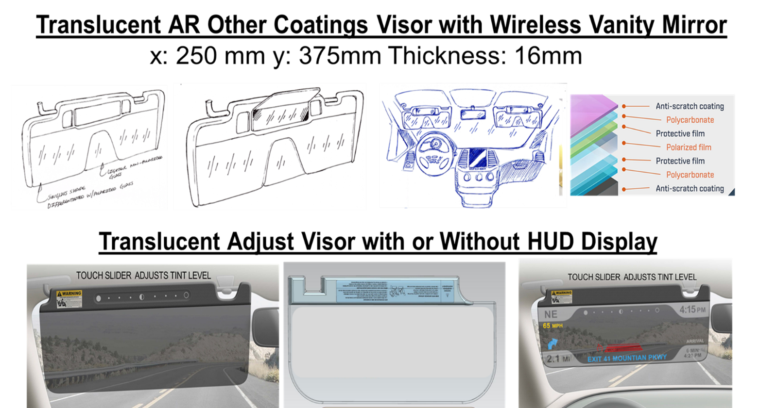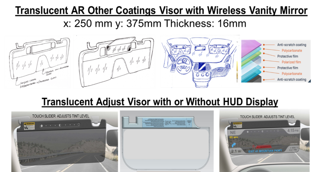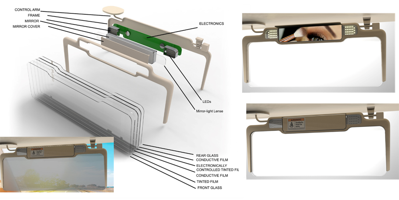 Self-adjustable translucent visor technology, visor blocks sun light proportionally to incoming sunlight intensity. The key feature targets with work on some to validate as below: