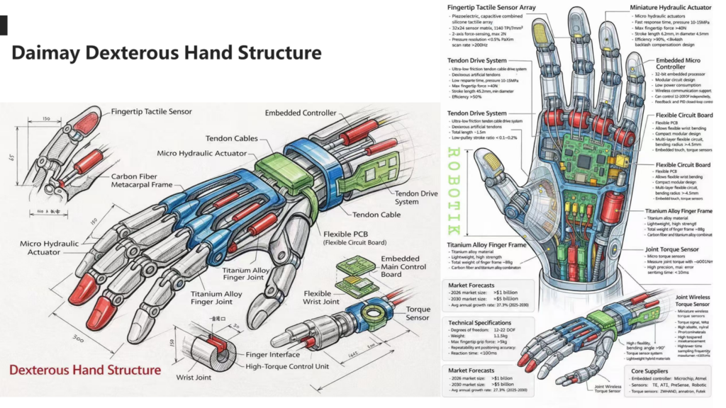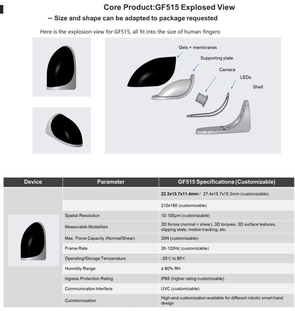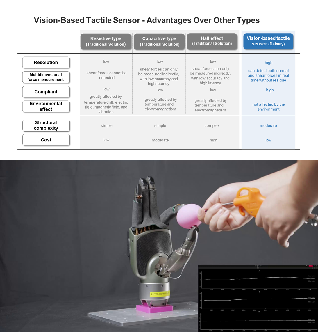 Daimay tactile sensor is vision based. It generates a camera system that converts elastomer deformation into precise part geometry mapping and applied force measurement. This is advanced technology than traditional capacitor/resistor sensor which hard to read shear force and parts geometry.