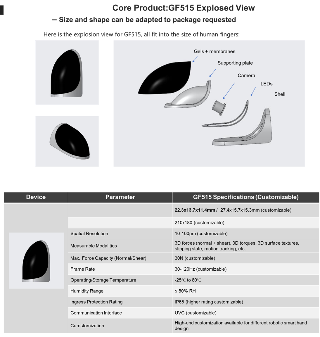 • It provides extremely detailed, accurate, and repeatable surface data at the 10-micron level in real time, with 10,000x higher resolution than traditional tactile sensors.